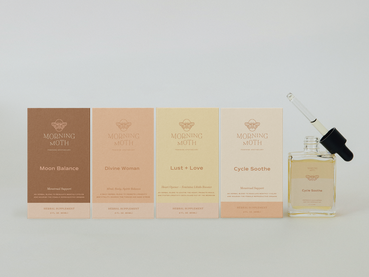 The hand-drawn moth icon carries hidden, meaningful elements—like subtle ovaries, feminine eyes, and moon symbols, allowing the brand story to shine through without extra graphics. Paired with thoughtful textures, patterns, and a mix of fonts inspired by vintage apothecaries, these elements work together or separately to create a flexible, memorable identity that feels modern, whimsical, and deeply aligned with the brand’s mission.